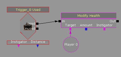 Now set the Modify Health to, say, 10 damage per press, and set the Max Trigger Count of the Trigger to zero! If we then connect these up;